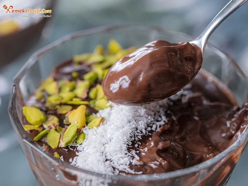 Derin bir tencereye un, toz şeker ve sütü ilave edip, karıştırarak pişirin. Isınmaya başlayınca tereyağını ilave edin ve karıştırmaya devam edin. Ocaktan alınca vanilyayı ilave edip, mikser yardımıyla 3 – 4 dakika çırpın. Muhallebiniz hazır olunca servis edeceğiniz kaba yayın. Küçük bir tencereye çikolata sos için olan more